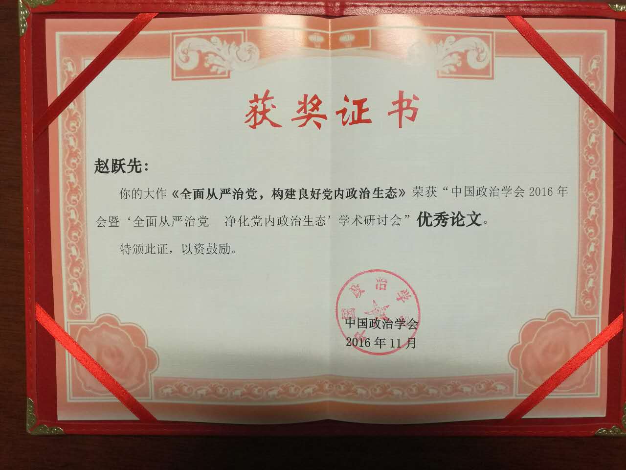 本次年会为期2天,政治学界知名专家高建、包心鉴、张献生、杨海蛟、王浦劬、桑玉成、张桂琳、周光辉、房宁、周平,以及来自中国社科院、北京大学、复旦大学、浙江大学等中国政治学研究领域的专家学者近400余人出席会议。新葡官网教师赵跃先、胡志远和政法学院赵笑蕾老师参加了本次年会。本次会议共收到论文143篇,最终评出“优秀论文”11篇,新葡官网教师赵跃先教授撰写的论文《全面从严治党,构建良好党内政治生态》获“优秀论文”奖。