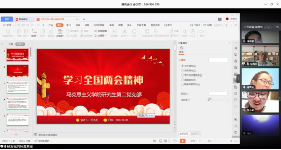 6月10日晚8点,3003新葡官方网站研究生第二党支部通过线上方式开展了专题党课学习,旨在鼓励支部党员聚焦两会热点,学习两会精神,提升党性修养。此次党课学习由组织委员姜延博主持,由杨海亮书记主讲,支部全体党员参会学习。