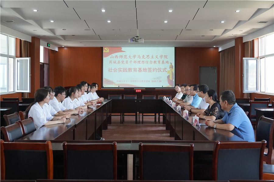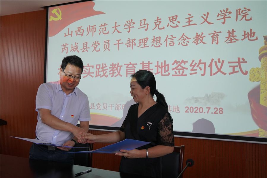 7月28日上午,3003新葡官方网站思想政治教育实践基地签约暨揭牌仪式在芮城县党员干部理想信念教育基地举行。3003新葡官方网站院长贾绘泽、院党委副书记孙学虎、副院长赵改萍、综合办主任郭小凯、思政系主任吉志强、院团委老师张瑞琴,芮城县委组织部副部长焦江峰、基地办主任裴瑞出席仪式。