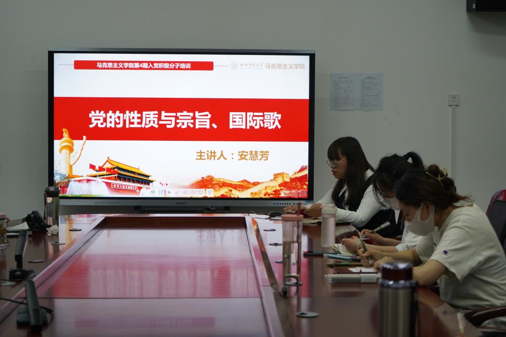 开班典礼后,校党委常委、副校长兼院长贾绘泽围绕中国特色社会主义制度自信的重大意义、基础和依据、问题及对策,以及如何坚定制度自信等方面展开讲述,提高了学员们的政治觉悟和理论素养;院党委副书记孙学虎为学员们详细讲解了发展党员的工作程序,强调了发展党员的总则、入党条件、基本要求,鼓励大家要不断提升自身素质,逐步向党组织靠拢;副院长兼“守正创新”教工党支部书记赵改萍从中国共产党百年历史上的三个历史决议谈起,为学员们讲述了党的初心使命,系统全面地解读了十九届六中全会精神,带领大家从中汲取奋进力量;“守正创新”教工党支部组织委员兼纪律委员何志华以背景冬奥精神为主题,围绕举办冬奥会的历史意义、巨大成绩、历史经验、基本情况等内容,为大家上了一堂精彩的冰雪思政课;研究生第一党支部组织委员兼纪律委员崔龙燕结合相关视频与学员们一同回顾了中国抗疫纪实,感受了无数无名英雄用生命赴使命,用大爱护众生的伟大精神,重点讲授了抗疫中的青年担当,引导学员们珍惜来之不易的抗疫成果和激励大家为抗疫贡献青春力量;研究生第二党支部组织委员兼纪律委员姜延博从“不忘初心的关键是要走群众路线”的角度出发,带领学员们在百年党史中感悟无产阶级政党的人民情怀,勉励大家要修炼“功成不必在我”的境界,锤炼“功成必定有我”的担当;本科生党支部书记张玉婷为大家讲解了党的理论创新和实践创新,教育引导学员们理解党员是创新的先锋,要在日日行、常常做的过程中发现问题,在解决问题的过程中实现创新;院专职组织员安慧芳领学了《中国共产党章程》和《入党教材》,加深了学员们对党的基本理论、基本路线、基本方略等的理解,并带领大家一同学唱了《国际歌》。此外,本次培训过程中也将分组讨论贯穿于专题辅导,教育引导入党积极分子端正入党动机、增强党性观念,树立党员意识。
