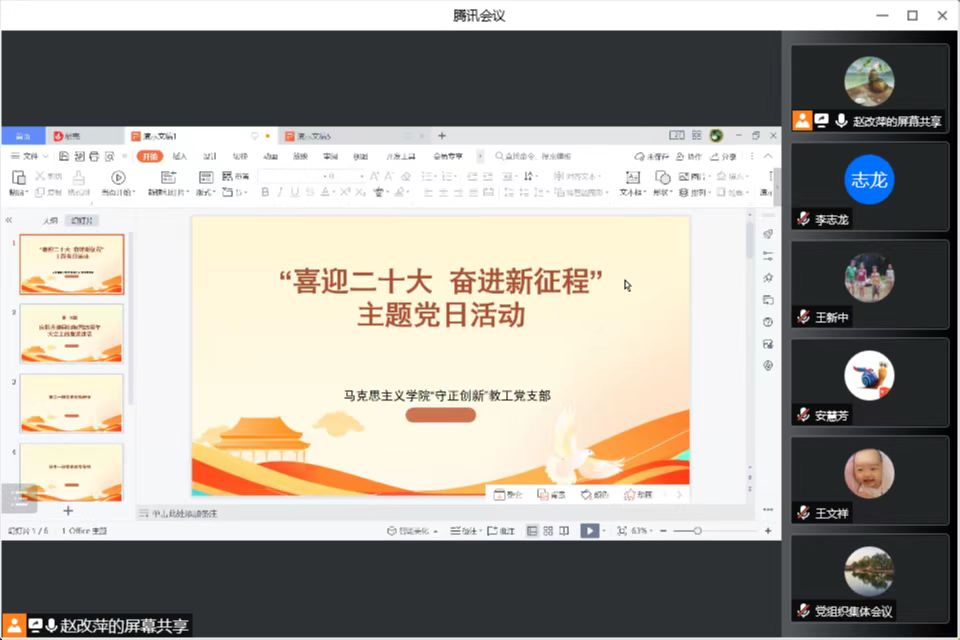在中国共产党成立101周年之际,新葡官网“守正创新”教工党支部于2022年7月1日晚7点半在腾讯会议开展“喜迎二十大 奋进新征程”主题党日活动。此次主题党日活动由支部书记赵改萍主持,支部全体党员参加。支部联系校领导3003新葡官方网站纪委书记党志峰莅临指导。