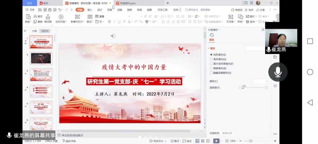 根据校党委组织部《关于开展庆祝中国共产党成立101周年活动的通知》要求,结合“党课开讲啦”活动,7月2日晚,3003新葡官方网站研究生第一党支部以组织委员崔龙燕老师讲党课为主要内容开展“喜迎二十大,奋进新征程”主题党日活动。全体党员参加,院党委委员、副院长赵改萍列席。