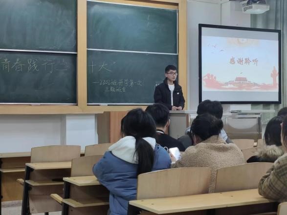 班会第四项,由班长和团支书对本学期的班级工作进行规划,并表示新学期全体班委们会接续奋发,不断为提升班级管理质量和更好服务班级同学奉献力量。