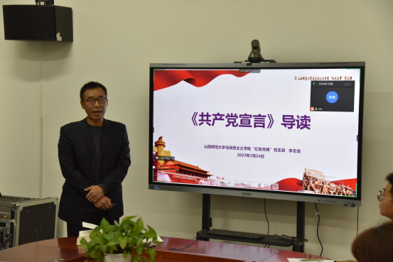 2023年3月24日晚上7点,新葡官网“红色先锋”党支部在南区1号楼506会议室开展马克思主义经典原著读书系列活动第四期,共同研读《共产党宣言》。此次活动由支部书记李志龙主持并领学,支部全体党员及入党积极分子以及“院青马工程”全部学员线上线下同时参加。