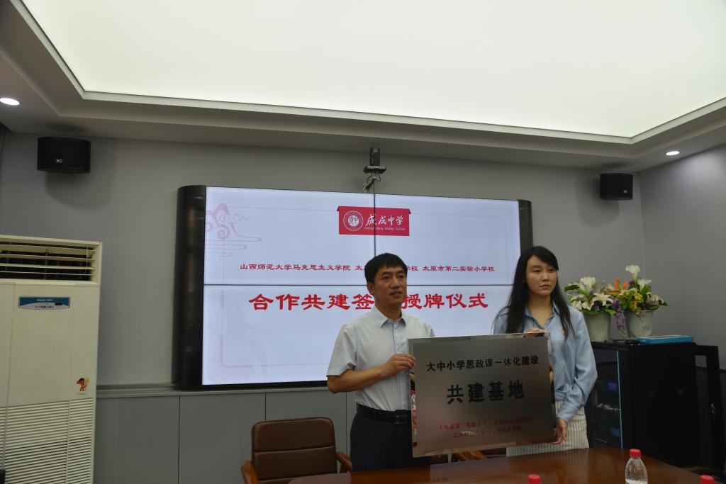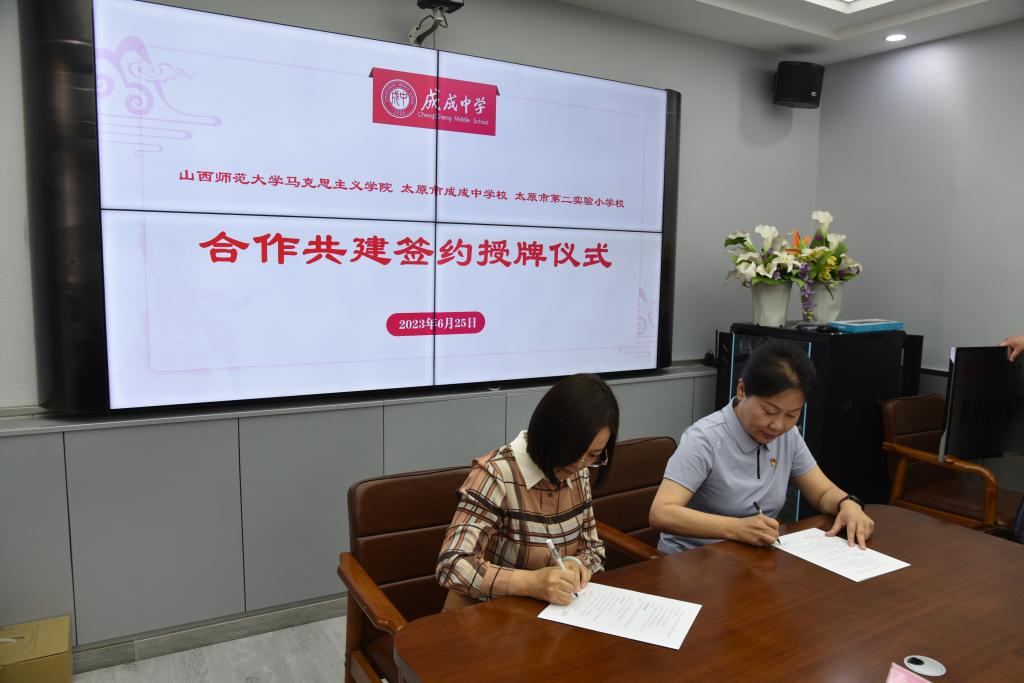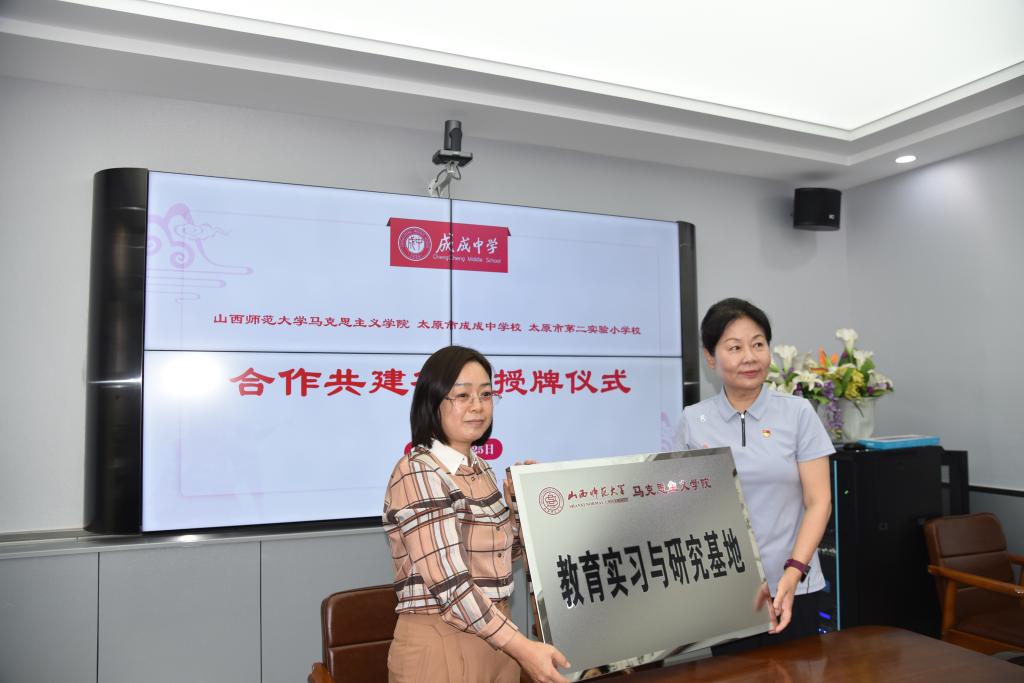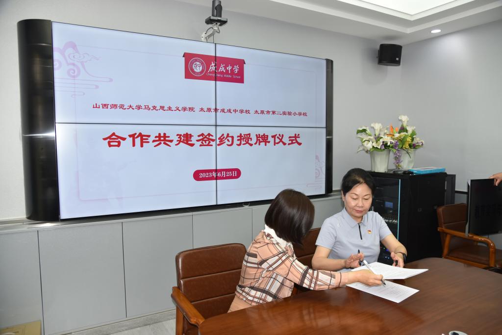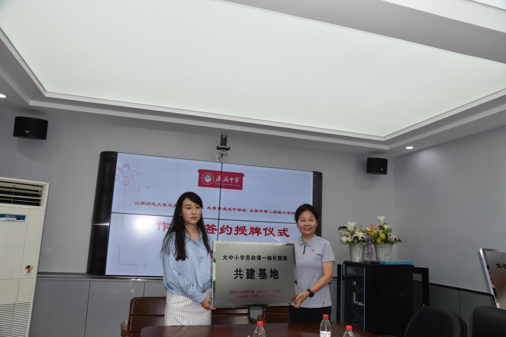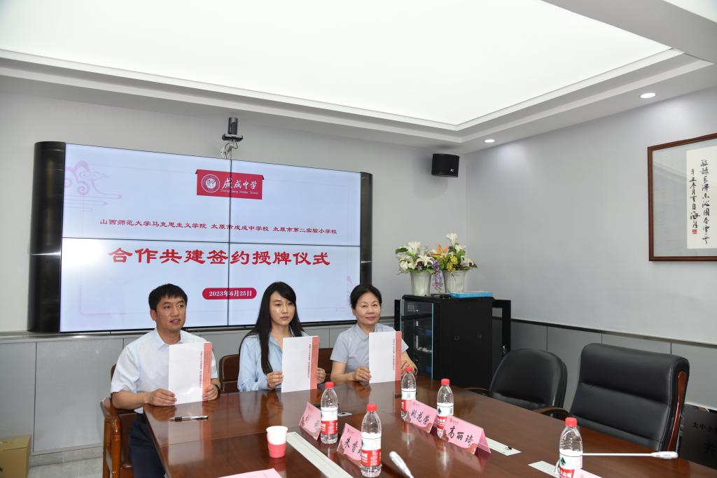 2023年6月25日上午,3003新葡官方网站与太原市成成中学校、太原市第二实验小学大中小学思政课一体化建设共建基地、教育实习与研究基地和志愿服务基地签约授牌仪式在太原市成成中学校迎泽校区隆重举行。
