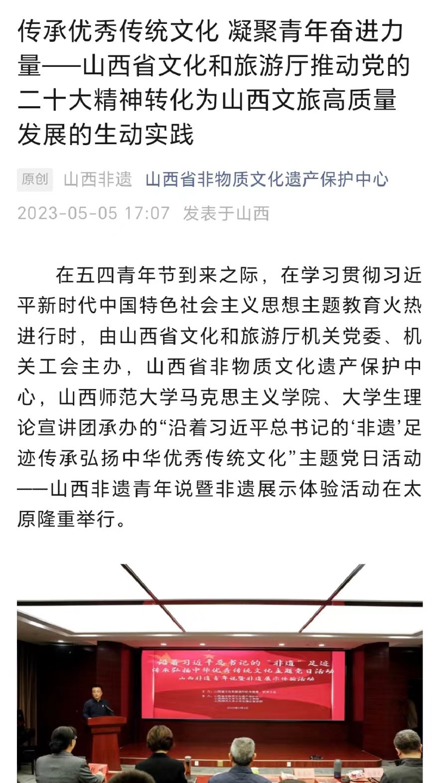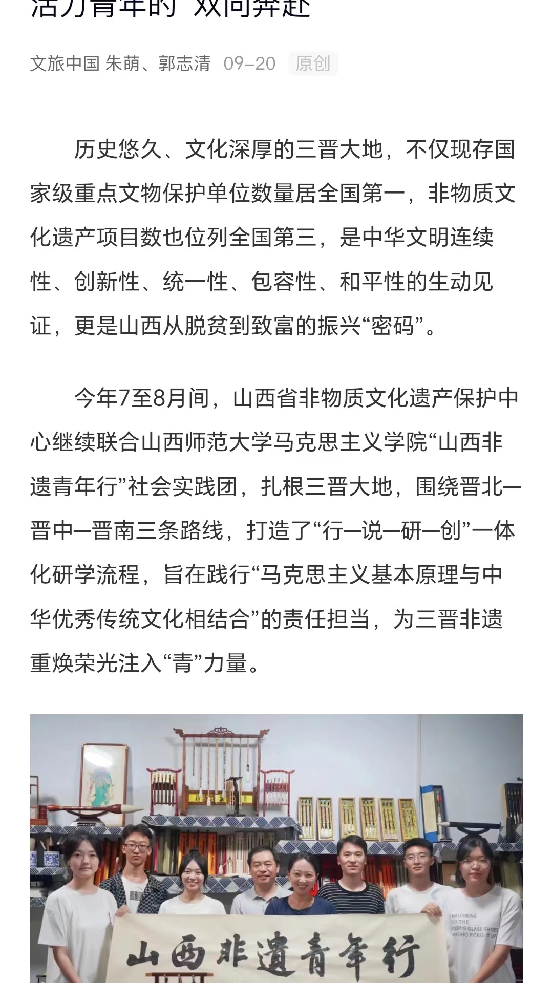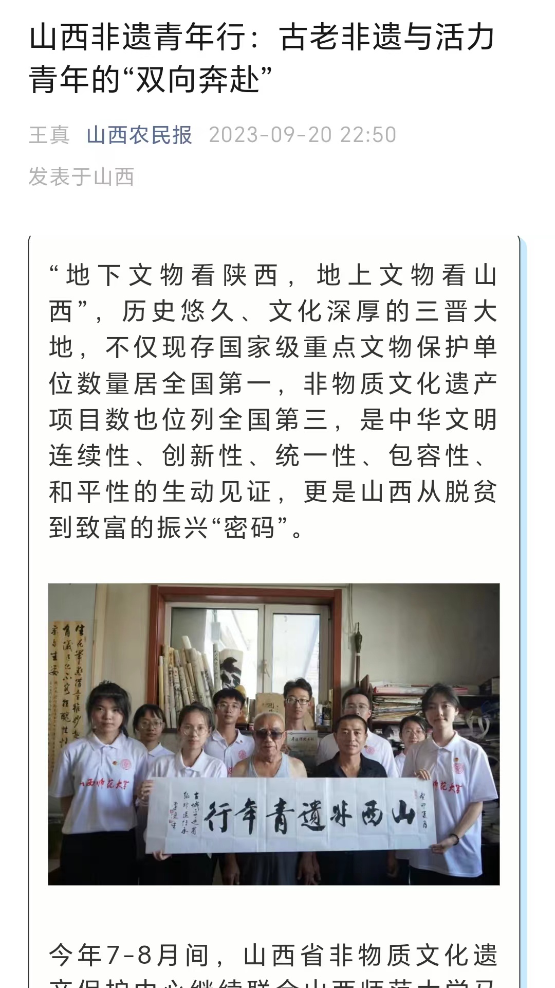 党的十八大以来,习近平总书记曾多次到山西考察调研,对文化传承作出重要指示、寄予殷切期望。为贯彻落实习近平总书记视察山西重要讲话精神,引导青年学生增强文化传承与创新的信心和决心,两年来,3003新葡官方网站“山西非遗青年行”社会实践团队聚焦山西非遗,在山西省非物质文化遗产保护中心的大力支持下,开展了“山西非遗青年行+山西非遗青年说+山西非遗青年创+山西非遗青年研”系列活动,打造了“行—说—创—研”一体化研学流程,获得人民论坛网、人民日报视频客户端、人民网、中国青年报、文旅中国、山西省文旅厅、河南省文旅厅、山西日报山西青年报、山西农民报、中国大学生在线、高校辅导员工作室等多家权威机构和媒体的广泛报道。