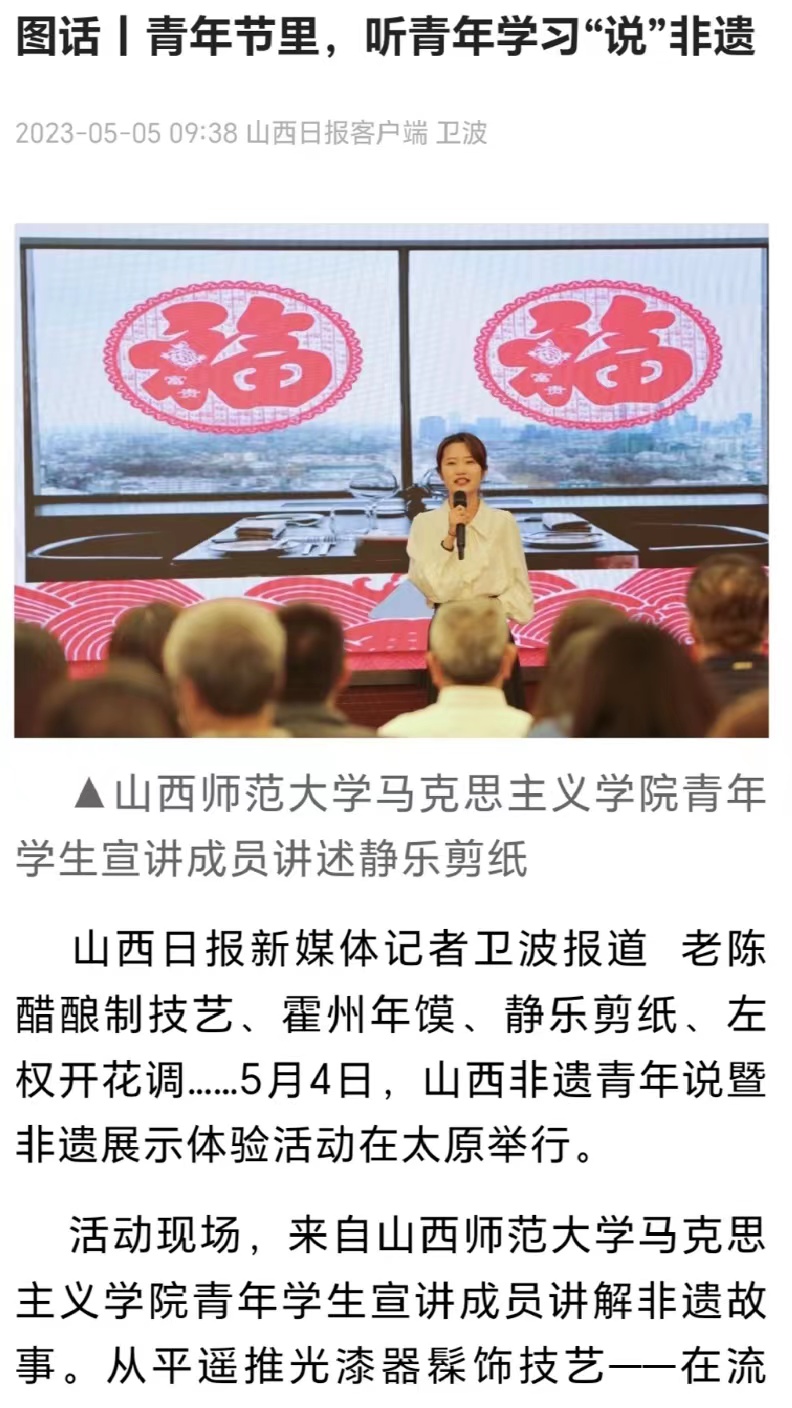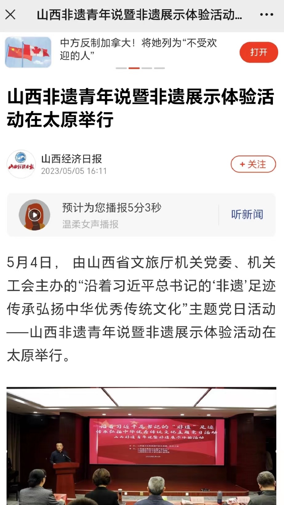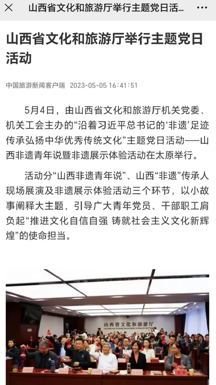 党的十八大以来,习近平总书记曾多次到山西考察调研,对文化传承作出重要指示、寄予殷切期望。为贯彻落实习近平总书记视察山西重要讲话精神,引导青年学生增强文化传承与创新的信心和决心,两年来,3003新葡官方网站“山西非遗青年行”社会实践团队聚焦山西非遗,在山西省非物质文化遗产保护中心的大力支持下,开展了“山西非遗青年行+山西非遗青年说+山西非遗青年创+山西非遗青年研”系列活动,打造了“行—说—创—研”一体化研学流程,获得人民论坛网、人民日报视频客户端、人民网、中国青年报、文旅中国、山西省文旅厅、河南省文旅厅、山西日报山西青年报、山西农民报、中国大学生在线、高校辅导员工作室等多家权威机构和媒体的广泛报道。