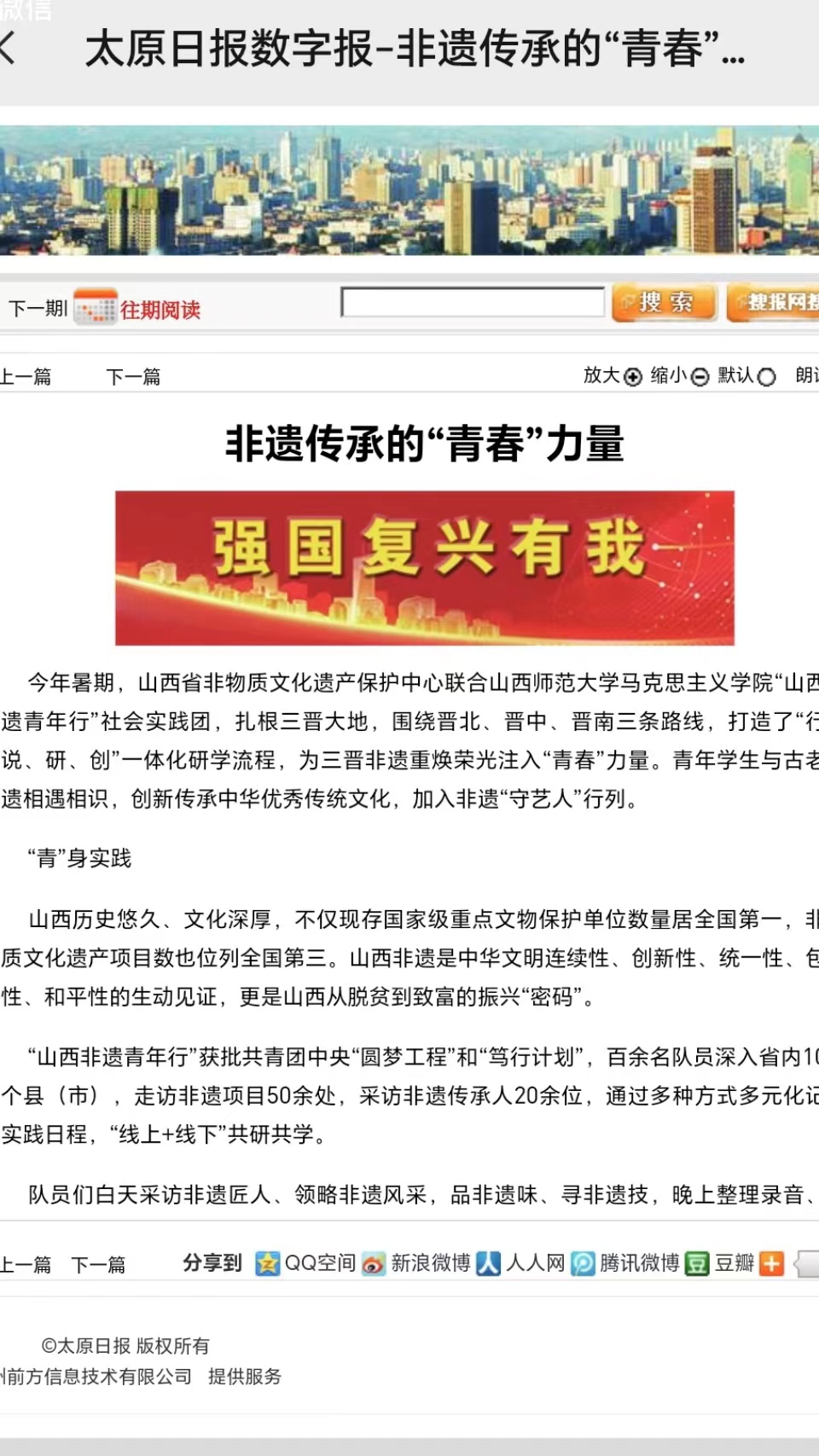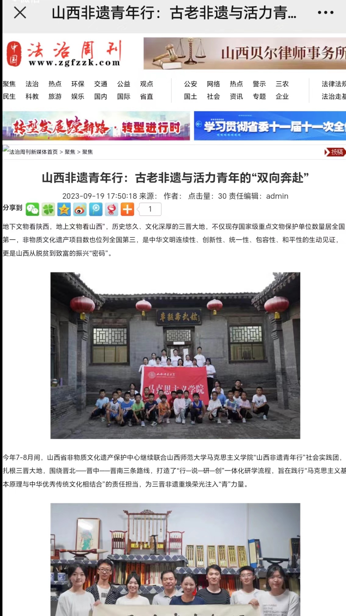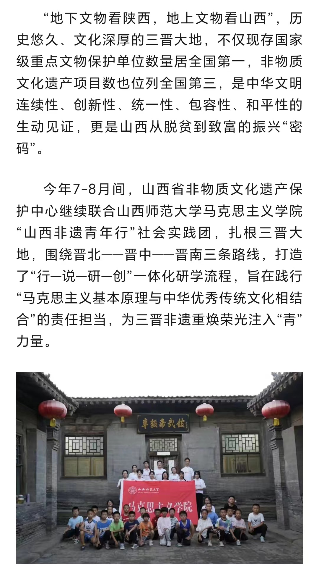 在践行“两个相结合”的深入推进下,新葡官网200余名“山西非遗青年行”团队队员沿着习近平总书记考察山西的重要足迹,循着三晋大地历史文化脉络,通过“线上+线下”共研共学的方式,深入省内10余个县市,走访了非遗项目50余处,全方位感受了山西非遗文化的独特魅力,领略非遗传承人在平凡中创造不凡、追求卓越、精益求精的“工匠精神”。团队成员们用脚步丈量三晋大地,用文字诠释非遗魅力,用行动传承非遗精神,践行“马克思主义基本原理与中华优秀传统文化相结合”的责任担当,为三晋非遗重焕荣光注入“青”力量。