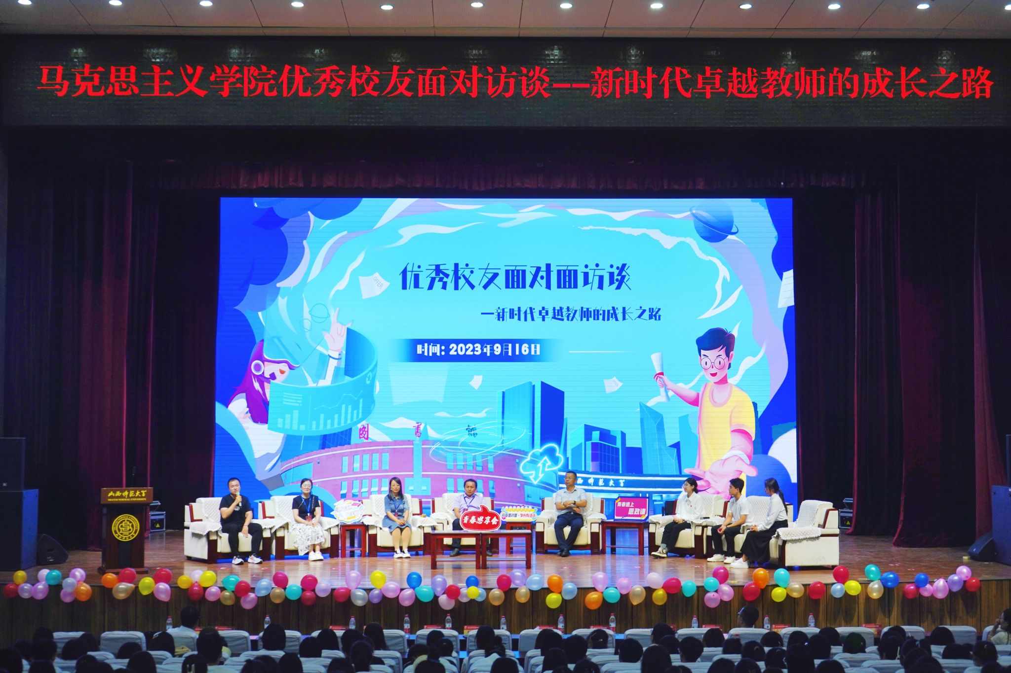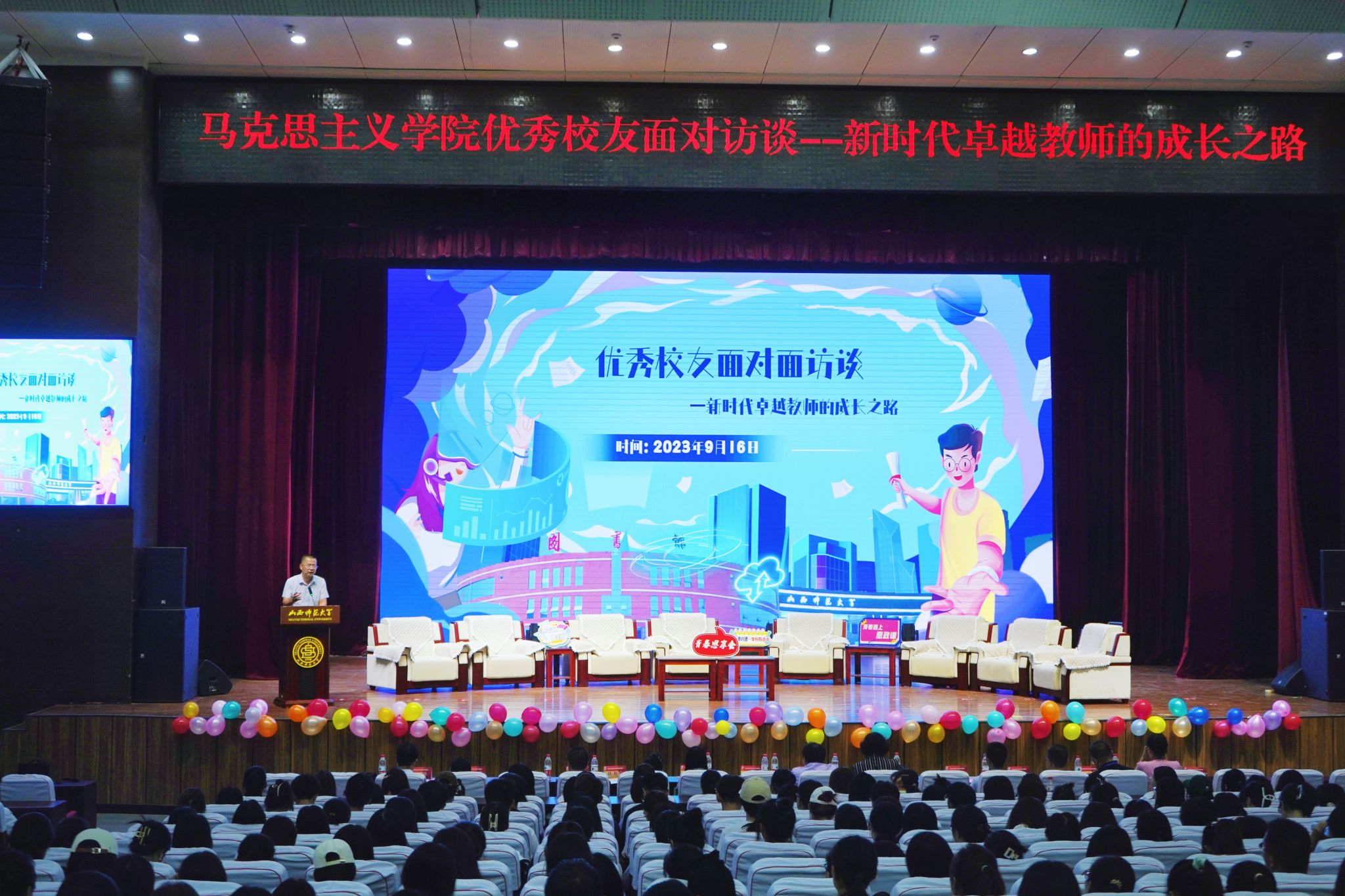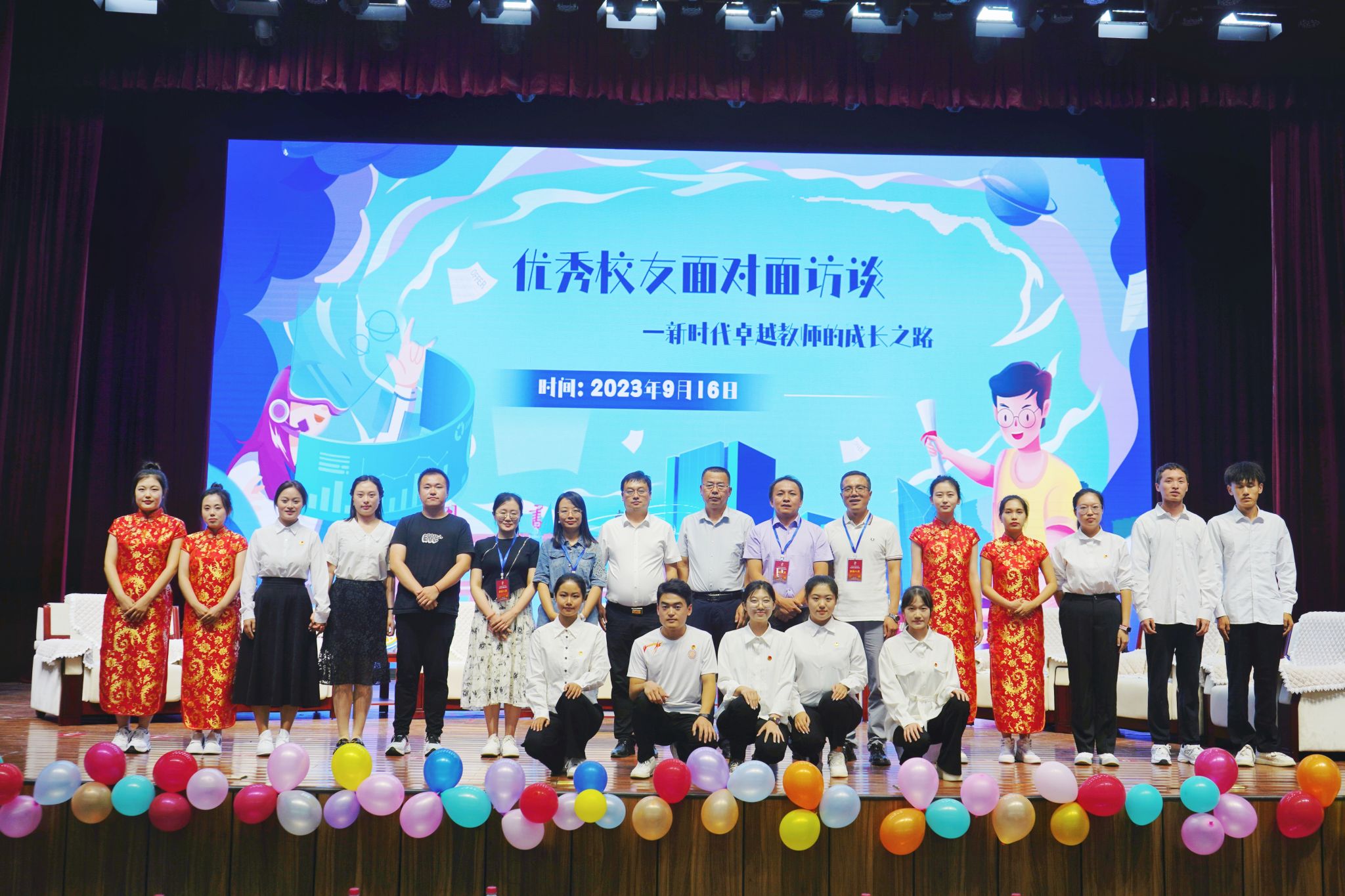 为了发挥优秀校友的榜样力量,提升师范生专业技能,助力学生思想引领和成长成才,值此学校建校65周年之际,3003新葡官方网站9月16日下午在南区科学会堂一层报告厅举办“优秀校友面对面访谈——新时代卓越教师的成长之路”活动。副院长赵改萍(主持行政工作)、院党委副书记杜辉出席活动,新葡官网十位优秀校友代表和本科生、硕士生代表400余人共同参加。本次活动由院团委副书记张瑞琴主持。