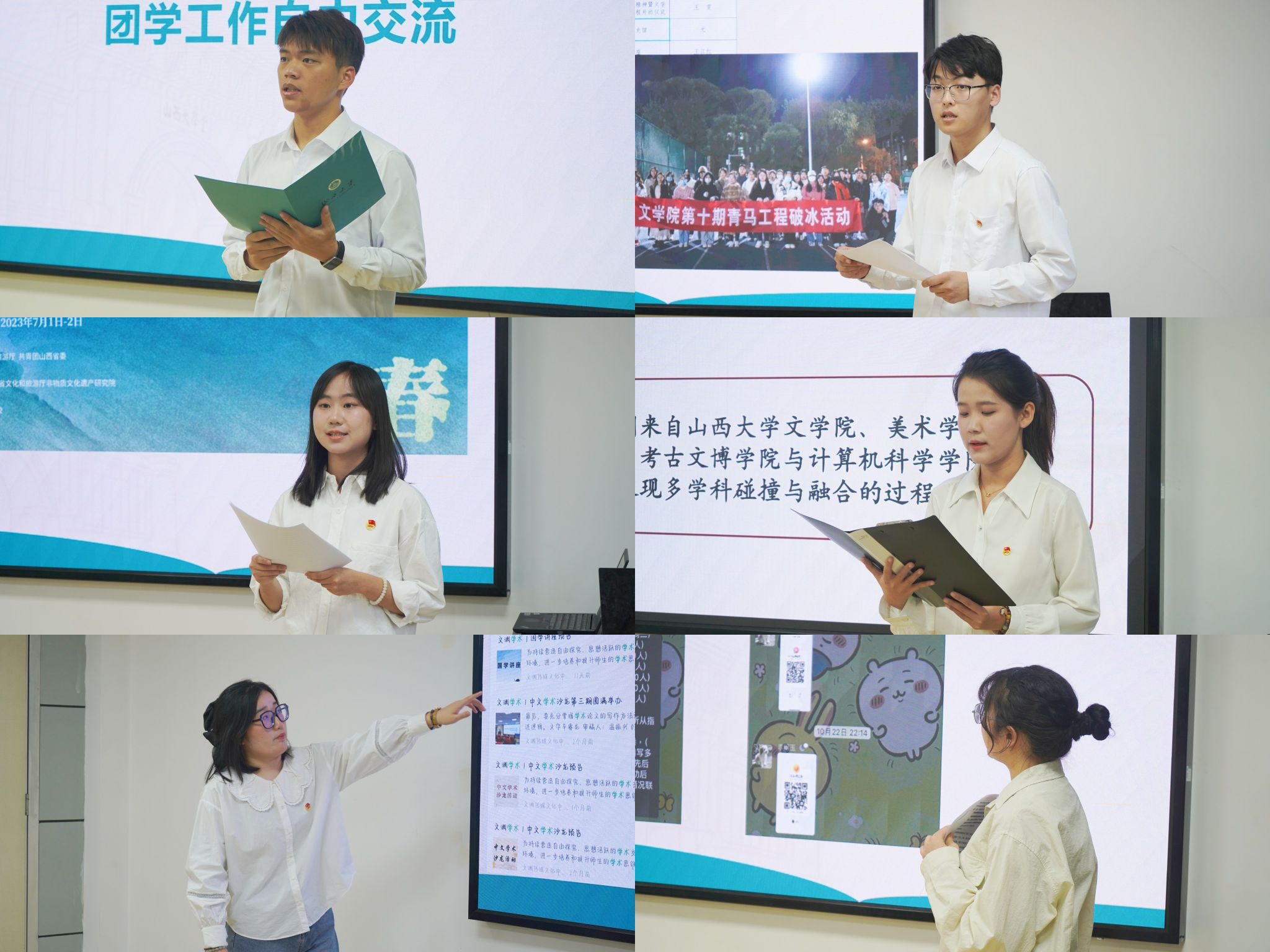 山西大学文学院学生团委副书记任书轩从团学制度、基层支部、青马活动、团学阅读栏目四个方面分享了文学院长期以来的团学建设工作成果。山西大学文学院学生会主席团成员吴月佳介绍了山西大学文学院学生会的工作情况,从学生会组织架构与工作出发,重点介绍了由文学院承办的2023年山西省大学生“非遗正青春”校园演说大赛和华北五省(市、自治区)大学生人文知识竞赛这两个大型比赛活动以及取得的工作成效。其中,山西大学“五龙寻梦”创业创新团队负责人焦雅馨同学介绍了团队的详细工作:在初识五龙中讲述创作初衷和调研故事,在多彩五龙中介绍团队开发的一系列产品,在数字五龙中解读数字平台的出发点和立足点,在聆听五龙和遇见五龙中讲述数字化传承与创新。山西大学文学院青年媒体中心李旸就最近的工作安排,从下设部门和工作风采总结了青年媒体中心长期以来改革探索出来的工作体质和方法,向大家分享了一些工作中的有益经验。山西大学文学院青年志愿者协会负责人郭冬雪则详细介绍了青年志愿者协会的下设部门及其基本的工作职能和举办的特色活动。