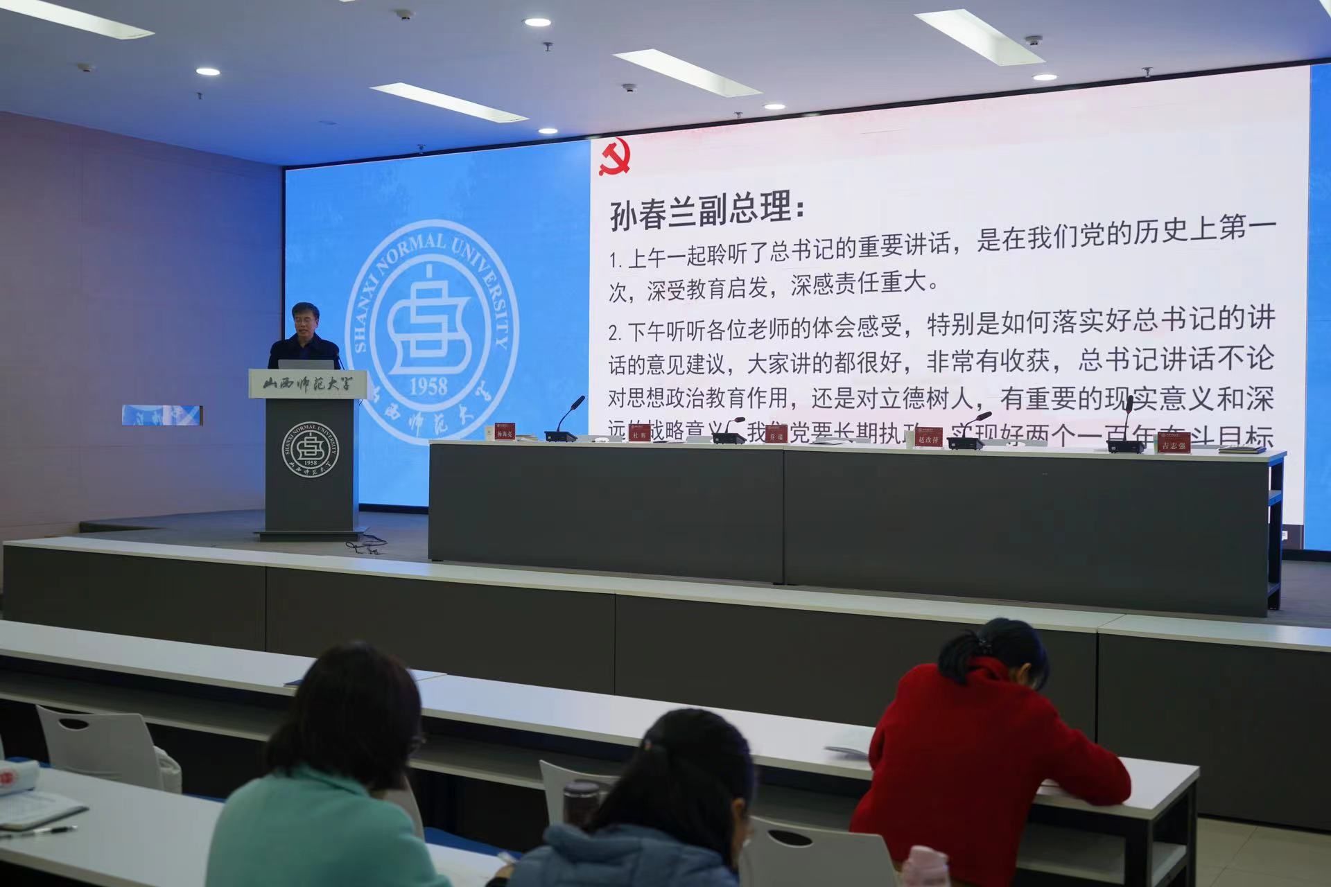 全国优秀教师、学校思想政治理论课教师座谈会参会代表赵跃先教授围绕办好思政课地位作用、思政课教师能力素质、上好学生真心喜爱进行了专题领学。教师代表杨源、周慧红分别结合课堂教学、当好思政课教师进行了交流发言。
