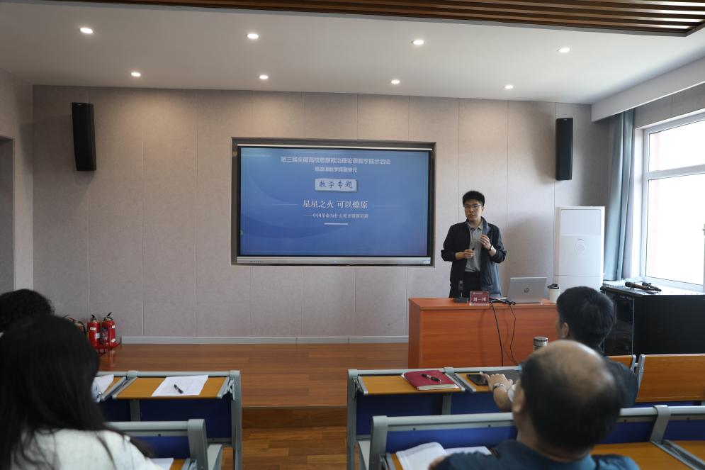 全国高校思政课教学展示一等奖获得者、南开大学刘一博老师作中国近现代史纲要课《星星之火 可以燎原》的示范授课,教育部第三届高校思政课教学展示特等奖获得者、山西工商学院张淑鸿老师作习近平新时代中国特色社会主义思想概论课《维护和塑造国家安全》的示范授课。同时,他们结合青教赛和教学展示比赛,分享了各自的经验。