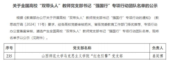 近日,全国高校“双带头人”教师党支部书记“强国行”专项行动团队名单揭晓,新葡官网“红色引擎”党支部成功入选。