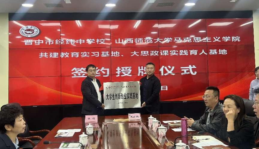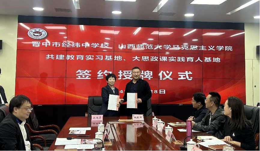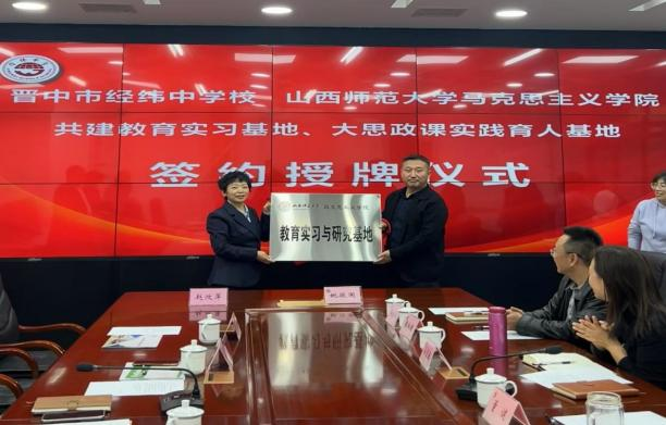 10月28日下午,新葡官网与晋中市经纬中学校共建教育实习与研究基地、大中小学思政课一体化建设基地、大学生创新创业实践基地签约授牌仪式在经纬中学校举行。仪式由经纬中学校副校长王宏主持,新葡官网常务副院长(正处级)赵改萍、党委副书记杜辉、副院长张昭、副院长杨海亮、思政系主任贾蕾以及经纬中学校领导班子参加。