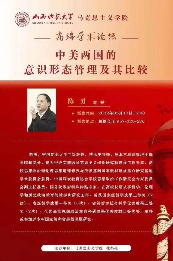 2022年5月12日下午3点,中国矿业大学(北京)二级教授、博士生导师、马克思主义理论研究和建设工程专家、国务院政府特殊津贴专家陈勇教授应邀为新葡官网师生作题为“中美两国的意识形态管理及其比较”的学术报告。报告以腾讯会议形式举行,由校党委常委、副校长、3003新葡官方网站院长(兼)贾绘泽主持,新葡官网全体教师和各年级研究生、部分本科生参加了此次报告会。