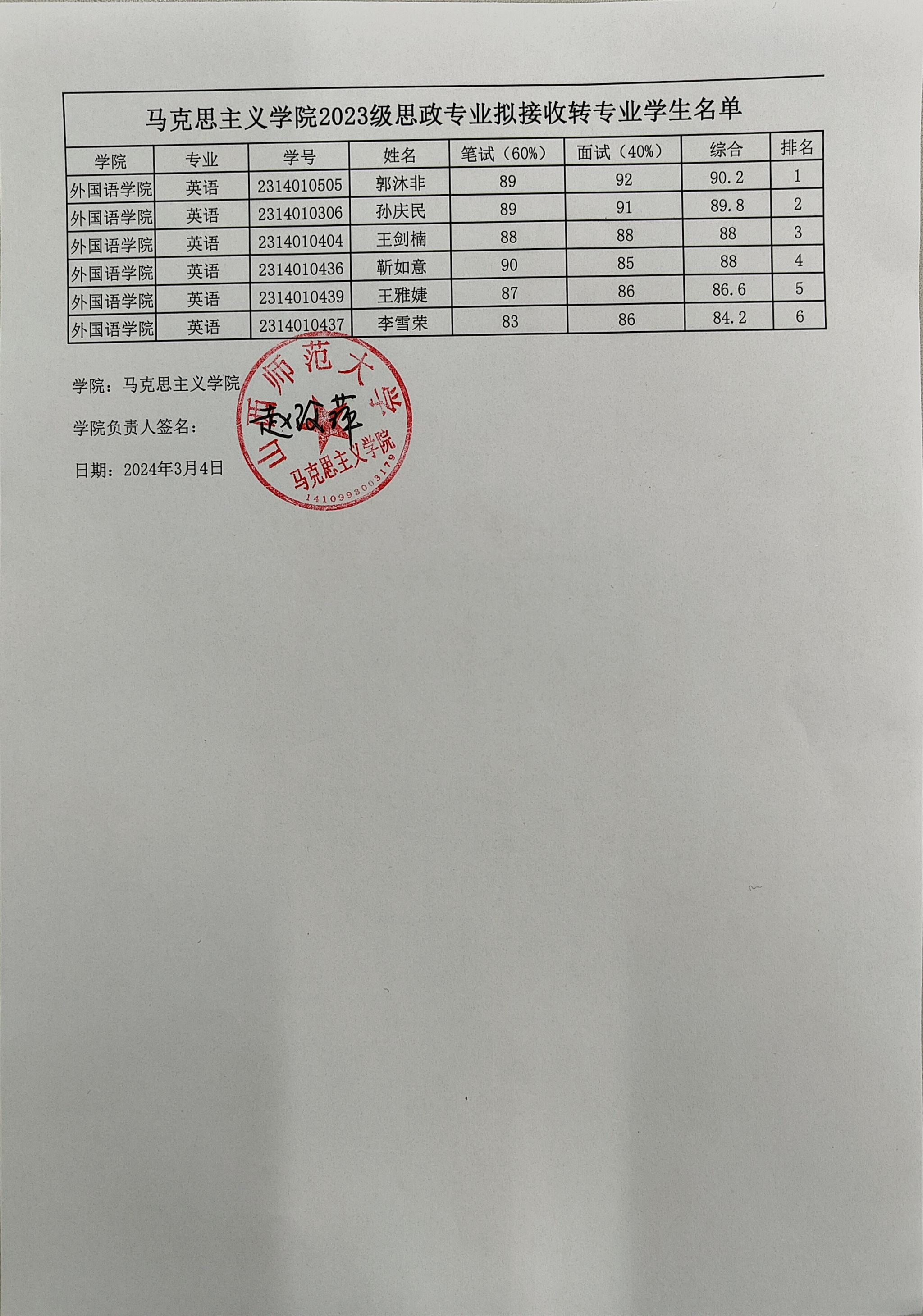 3003新葡官方网站2023级思政专业拟接收转专业学生名单