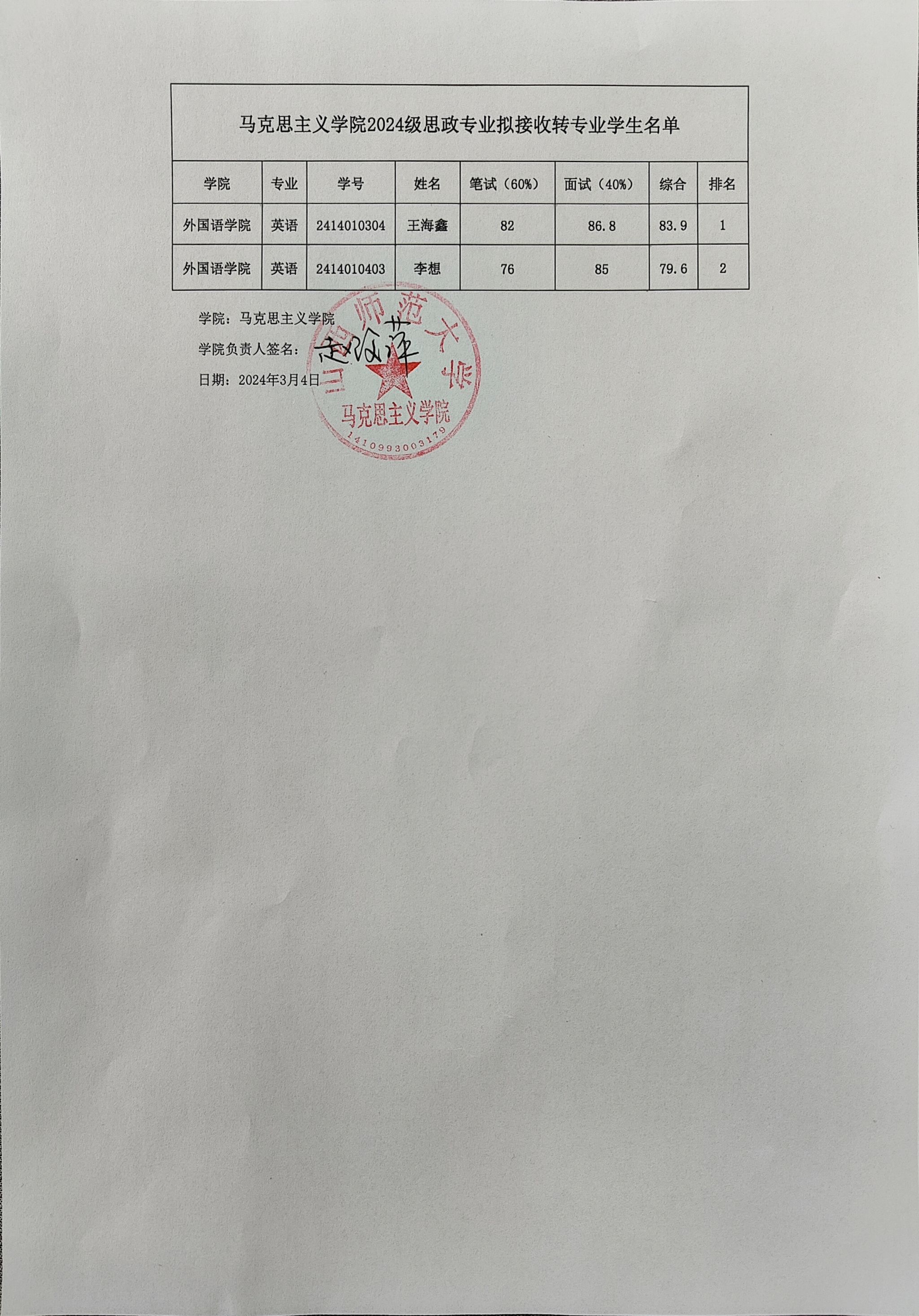 3003新葡官方网站2024级思政专业拟接收转专业学生名单