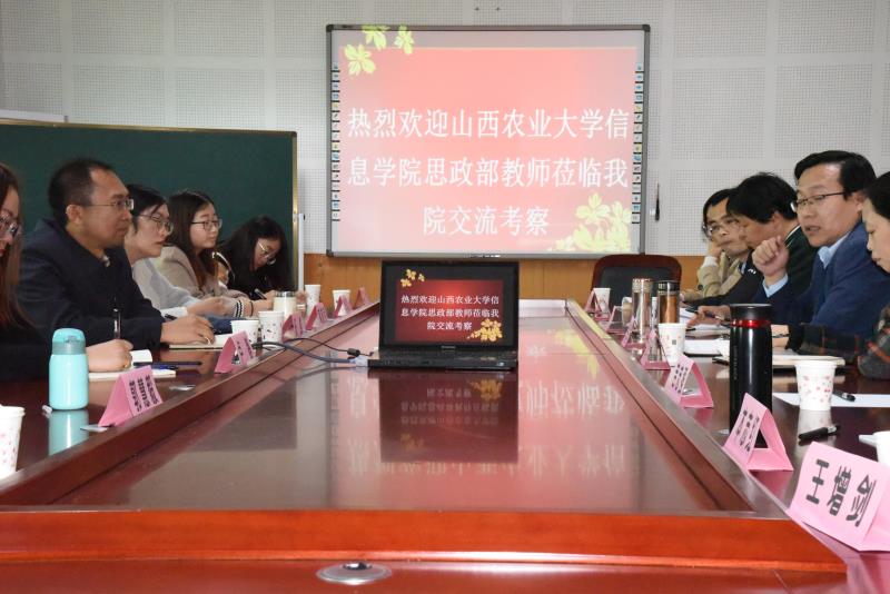 11月6日下午,山西农业大学信息学院思想政治理论教学研究部杨凯主任一行7人赴新葡官网交流考察。在科学会堂A508会议室,新葡官网院领导、各教研室主任与杨凯主任一行就精品课程建设、教学改革、课程建设等问题进行了积极交流。院长贾绘泽教授主持。