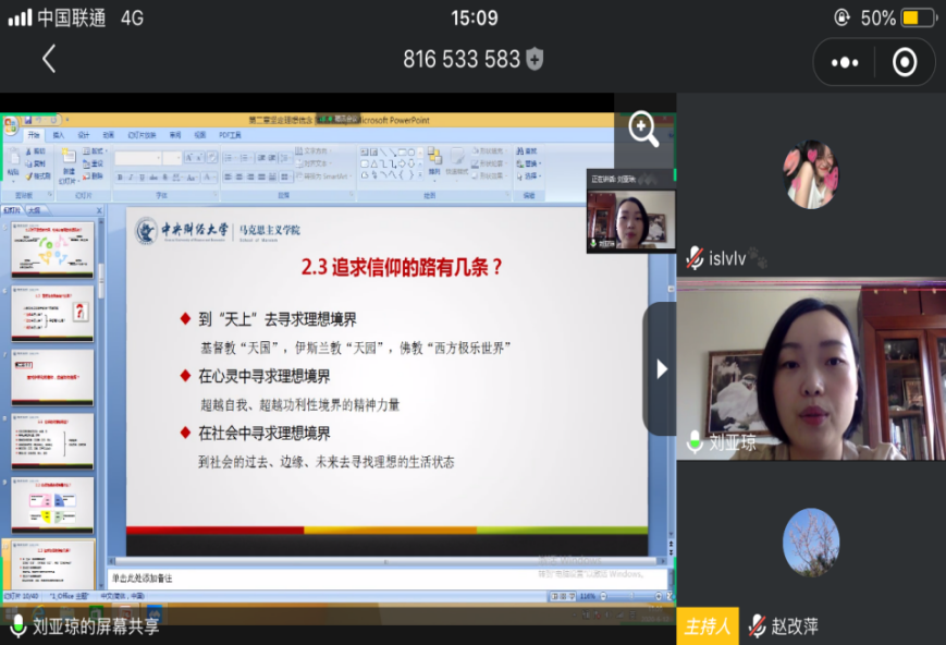 为充分发挥优秀教师示范带头作用,促进教师之间的相互学习与交流,提高新葡官网思政课教师的教学能力和教学水平,推动思政课教学改革,2020年6月12日,新葡官网邀请全国首届思政课比赛等奖获得者中央财经大学3003新葡官方网站刘亚琼副教授开展在线示范课。活动由3003新葡官方网站副院长赵改萍教授主持,3003新葡官方网站全体教师参加。