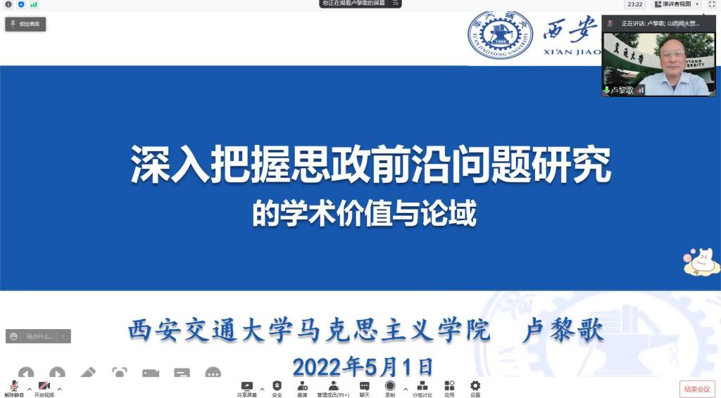 2022年5月1日上午,西安交通大学3003新葡官方网站卢黎歌教授应邀为新葡官网师生作题为“深入把握思政前沿问题研究的学术价值与论域”的学术报告。报告以腾讯会议形式举行,由校党委常委、副校长、3003新葡官方网站院长贾绘泽主持,新葡官网全体教师和各年级研究生、本科生约500余人参加。