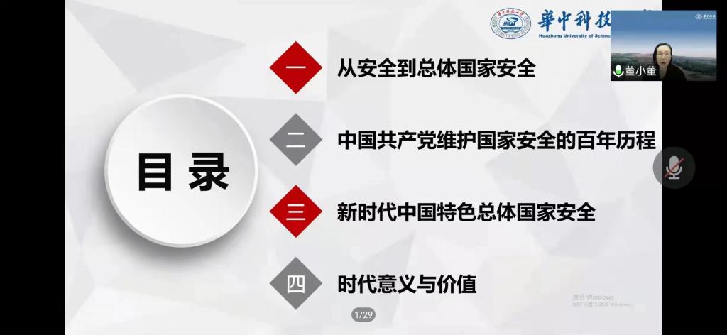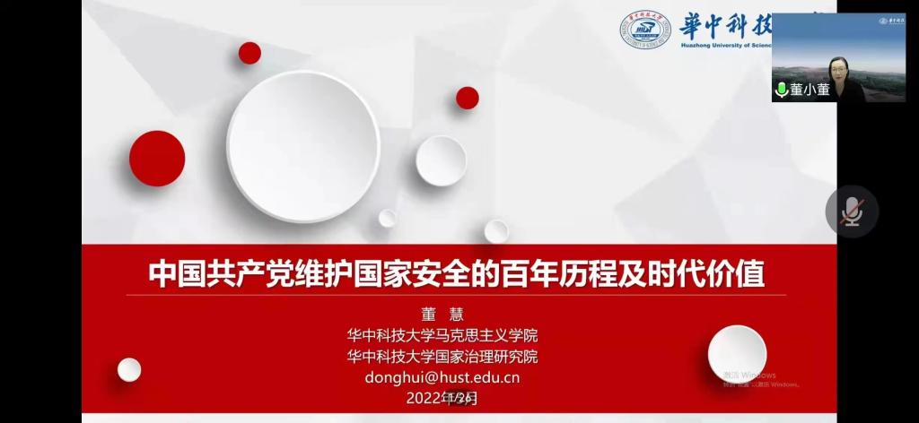 2022年5月10日晚7点,华中科技大学3003新葡官方网站教授,博士生导师、国务院第八届学科评议组成员董慧教授应邀为新葡官网师生作题为“中国共产党维护国家安全的百年历程及时代价值”的学术报告。报告以腾讯会议形式举行,由校党委常委、副校长、3003新葡官方网站院长(兼)贾绘泽主持,新葡官网全体教师和各年级研究生、部分本科生参加了此次报告会。