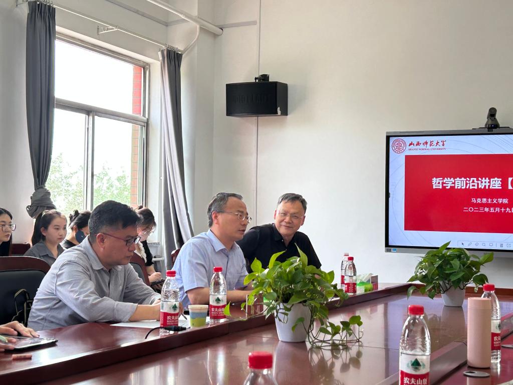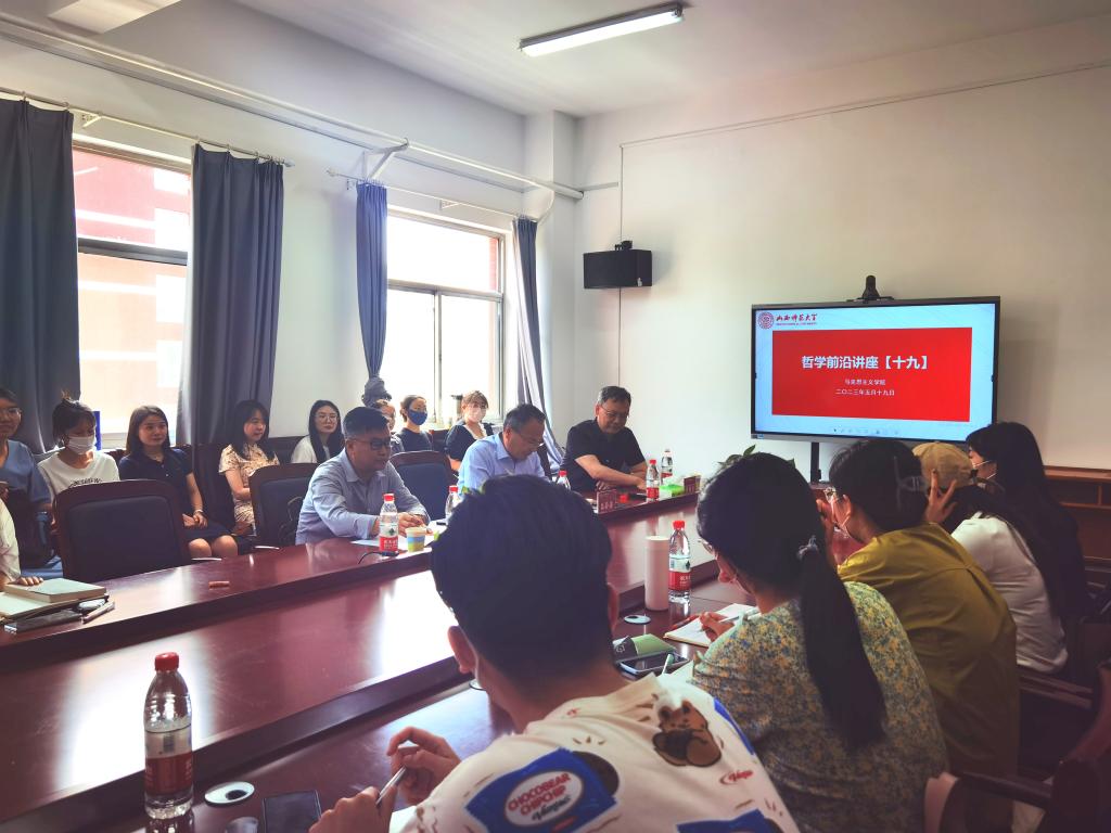 5月19日下午,中国人民大学文学院曾艳兵教授应邀来新葡官网作第十九次“哲学前沿讲座”,主题为“哲学化的文学与文学化的哲学——以存在主义文学为例”。讲座由新葡官网副教授聂静港主持,文学院副教授高超与谈。