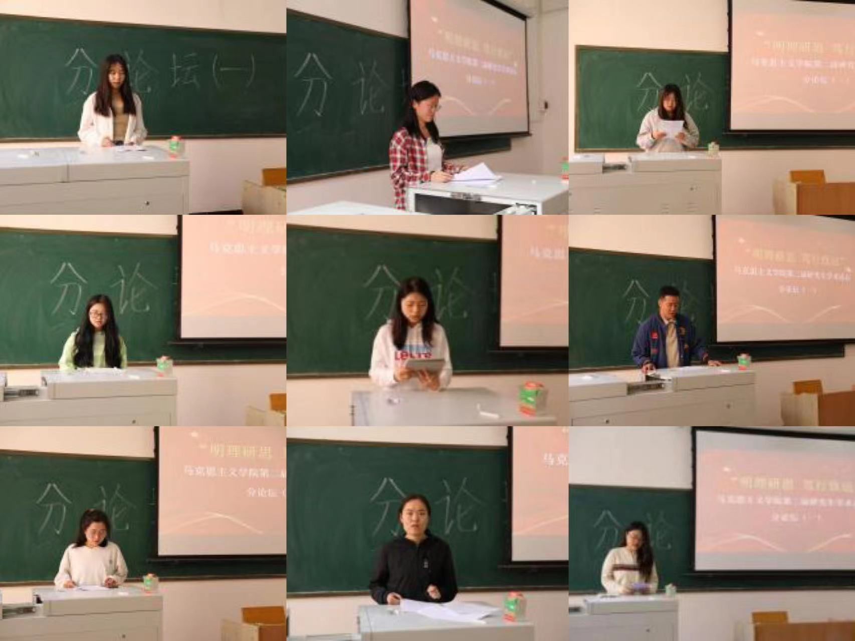 分论坛(一)第一组由辛依谡同学作“《湖南农民运动考察报告》调查研究方法考论”、李佳佳同学作“新时代红色影视剧的思想政治教育功能及其发挥研究”、郭未雪同学作“探析乡村振兴背景下乡村文化自信的实施路径”、赵淑贤同学作“红色叙事赋能高校思政课:价值、困境、路径”、李娟同学作“恩格斯国家观的思想渊源、理论内涵及当代价值”、高宇峰同学作“向世界讲好中国故事——新时代增强国际传播能力的三重逻辑”、张珂晓同学作“以人民为中心思想的文化哲学诠释及当代价值”、张佳丽同学作“《法德农民问题》中蕴含的农业现代化思想及其时代价值”的主题汇报。