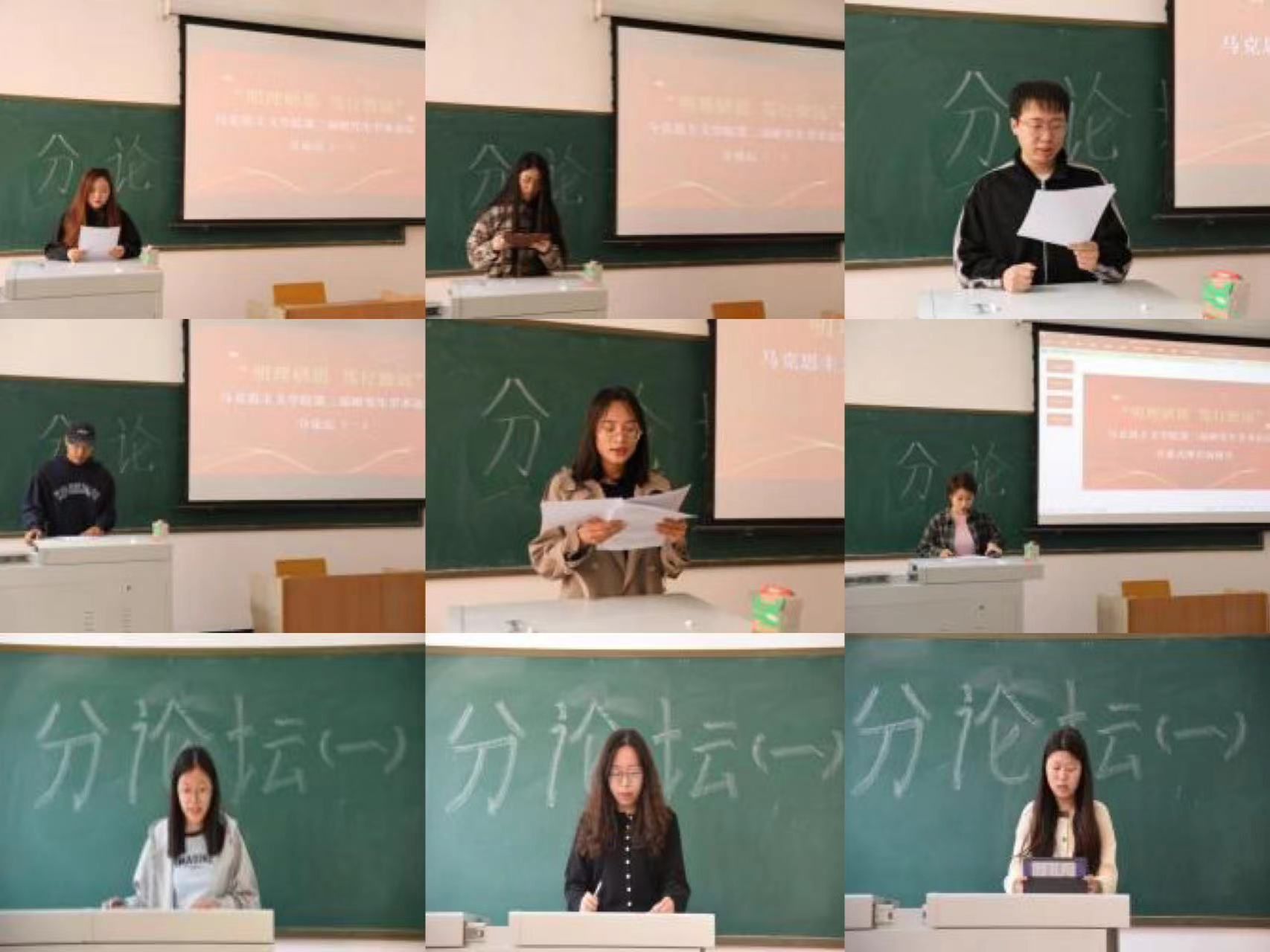 分论坛(二)第四组由张佳敏同学作“《历史与阶级意识》的总体性辩证思维探析”、邵心茹同学作“革命精神融入大学生思想政治教育的路径探析 ”、闫怡妮同学作“走好中国式现代化道路——基于《共产党宣言》中现代化思想的解读”、邵妞同学作“《反杜林论》中的平等观及其当代价值探析”、赵志花同学作“英语专业教学中思政元素的创新性融入”、李彩钰同学作“马克思的劳动美学思想融入高校劳动教育研究”、白凯辉同学作“人民至上价值追求助推新时代廉洁文化教育走深走实”、李敏瑞同学作“毛泽东调查研究思想推进马克思主义中国化的历史贡献研究”、杨凯杰同学作“党的自我革命的理论逻辑、历史经验与实践要求”、李佳敏同学作“精神上的独立自主:文化主体性的学理阐释”、裴嘉兴同学作“‘党团队’育人链条融入大中小学思想政治教育一体化的路径研究”的主题汇报。