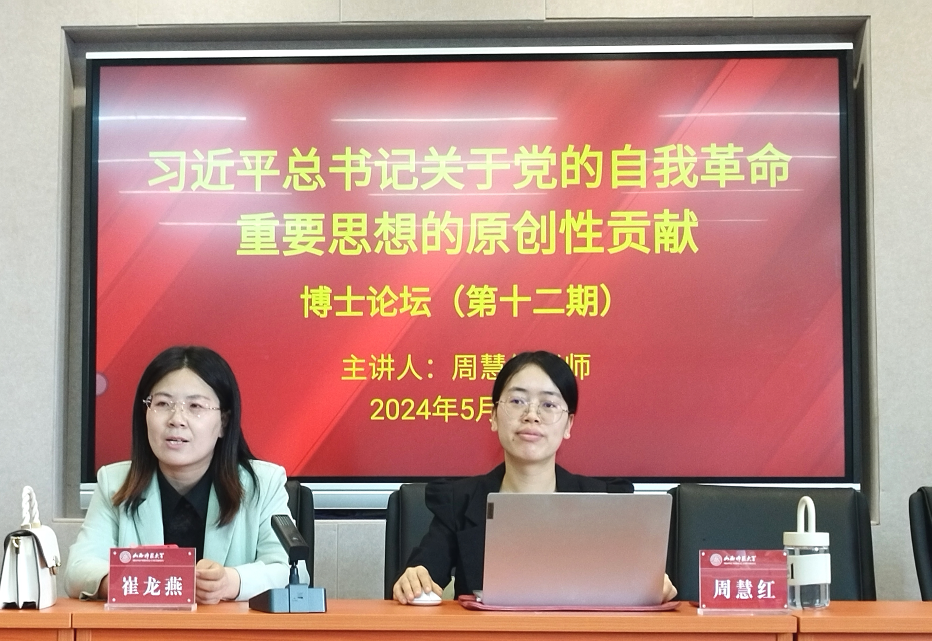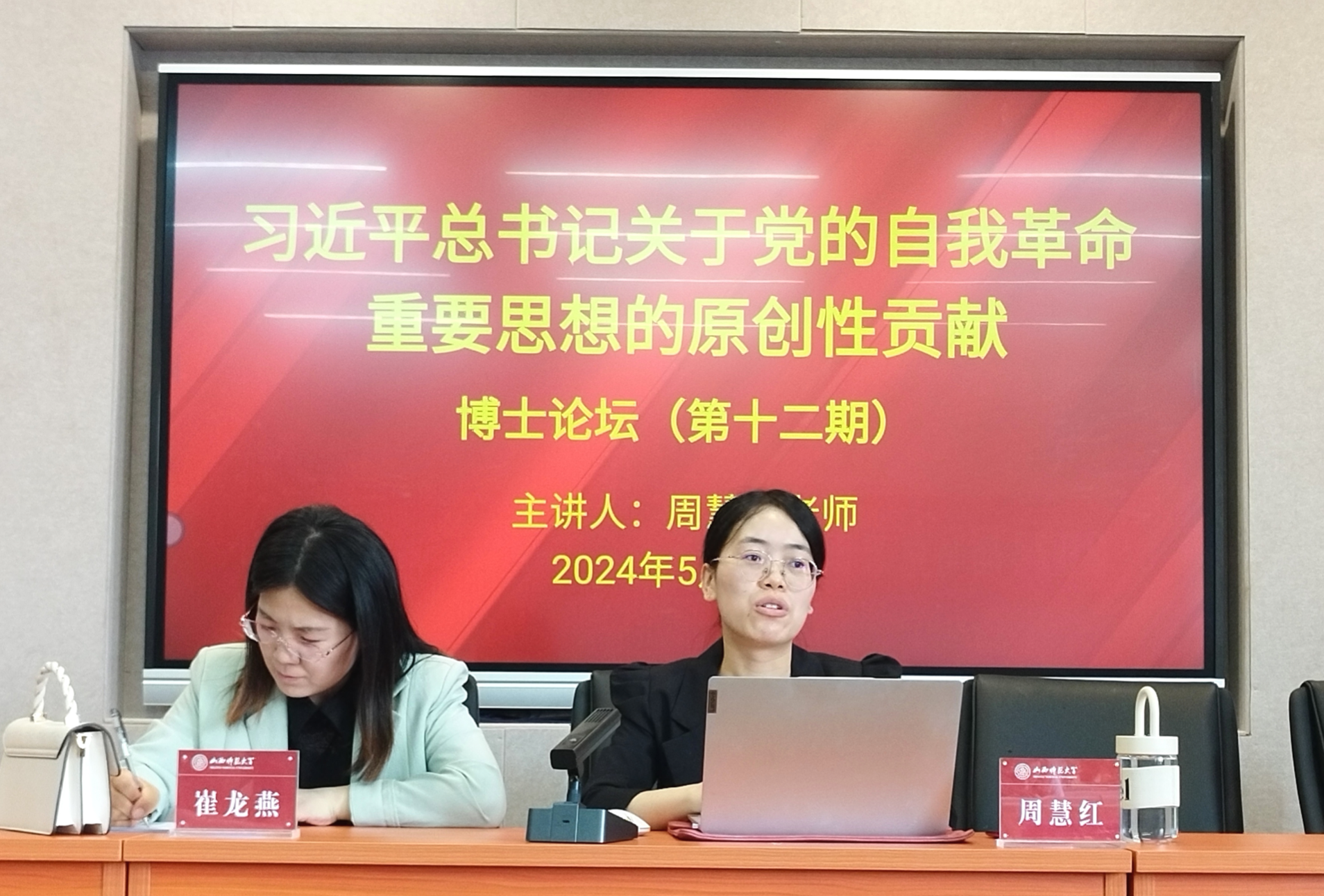 其次,周慧红老师作了题为《习近平总书记关于党的自我革命的重要思想的原创性贡献》的报告。她指出,新时代总书记对于革命赋予了新的色彩,党的十八大以来,习近平总书记就党的自我革命提出了一系列具有原创性、前瞻性的新理念新思想新战略,形成了习近平总书记关于党的自我革命的重要思想。新时代以来,在以习近平同志为核心的党中央坚强领导下,全党时刻保持解决大党独有难题的清醒和坚定,把全面从严治党作为新时代党的建设的鲜明主题,坚持全面从严治党永远在路上、党的自我革命永远在路上,不断深化对党的自我革命的规律性认识。