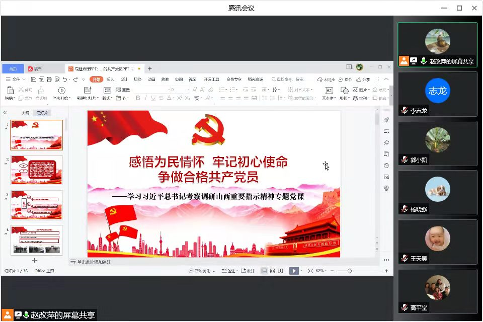 2022年2月25日晚7点半,3003新葡官方网站“守正创新”教工党支部在腾讯会议开展学习贯彻习近平总书记考察调研山西重要指示精神主题党课。支部书记赵改萍讲授党课,支部全体党员参加。