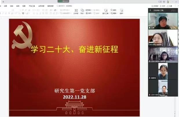 11月28日,新葡官网研究生第一党支部以党的二十大精神交流研讨为主要内容,开展“学习二十大、奋进新征程”主题党日活动,全体党员参加交流。