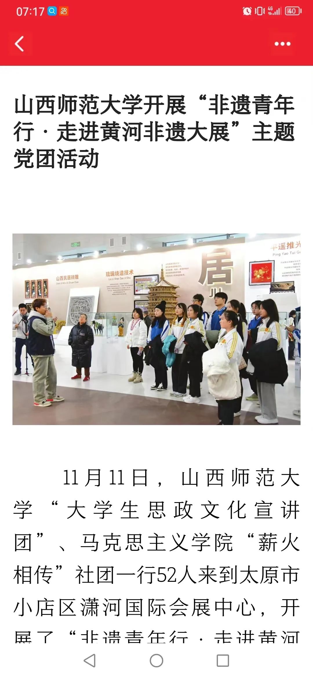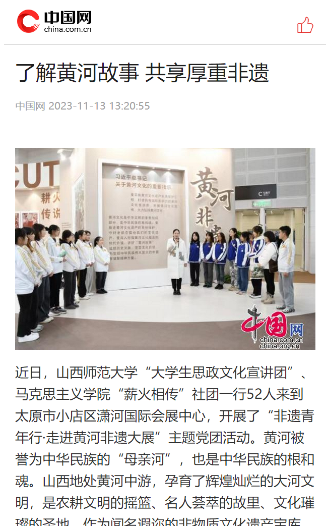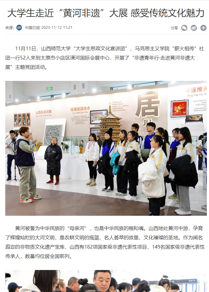 为贯彻落实习近平总书记考察山西重要指示精神,引导青年积极投身于文化传承与创新的实践中去,为非遗的保护与传承注入新活力,11月11日上午,新葡官网团委联合3003新葡官方网站“薪火相传”党支部开展了“以文化人 凝心铸魂——非遗青年行·走进黄河非遗大展”主题党团活动,新葡官网团委学生会各部门学生代表、本科生“薪火相传”党支部师生代表、青马骨干培训班学生代表以及大学生理论宣讲团学生代表共同参加。