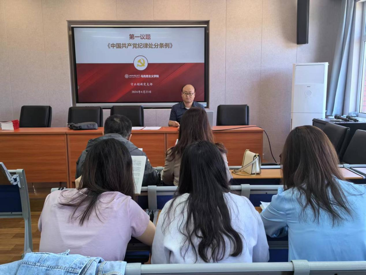 支部书记杨海亮同志传达了学校、学院党纪学习教育动员部署会议精神,宣读了《3003新葡官方网站党委党纪学习教育工作方案》,支部党员轮流逐字逐条学习了《中国共产党纪律处分条例》总则部分。围绕如何认识党的纪律建设在推动解决大党独有难题、健全全面从严治党体系中的地位作用进行交流研讨。