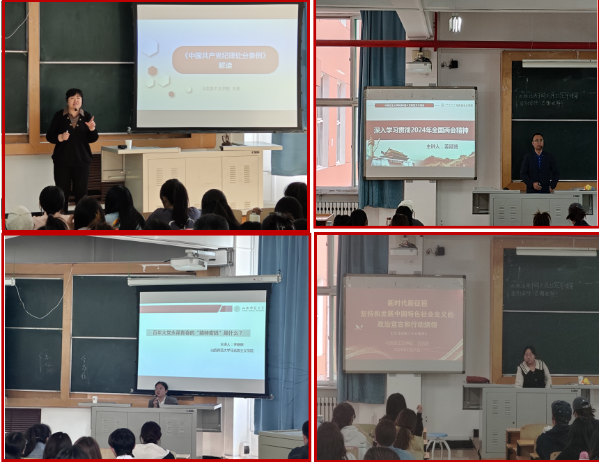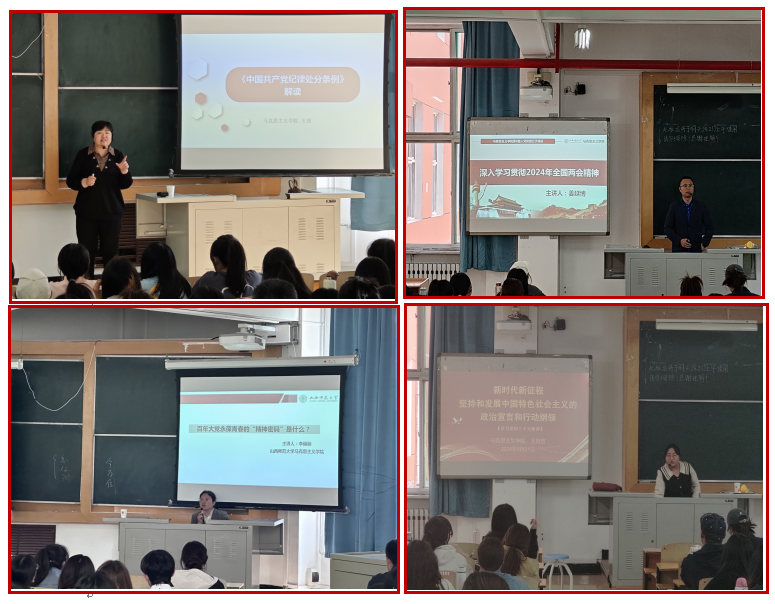 开班典礼后,“求真力行”党支部书记王艳、“薪火相传”党支部组织委员兼纪律委员、“红色引擎”党支部书记姜延博、青年博士王培培老师、院专职组织员兼“红色先锋”党支部副书记安慧芳分别作了“《中国共产党纪律处分条例》解读”“百年大党永葆青春的精神密码”“深入学习贯彻2024年全国两会精神”“新时代新征程坚持和发展中国特色社会主义的政治宣言和行动纲领”“全国宣传思想文化工作会议精神”“认真学习和领会党的二十大通过的《中国共产党章程(修正案)》”“发展党员程序”专题讲授。