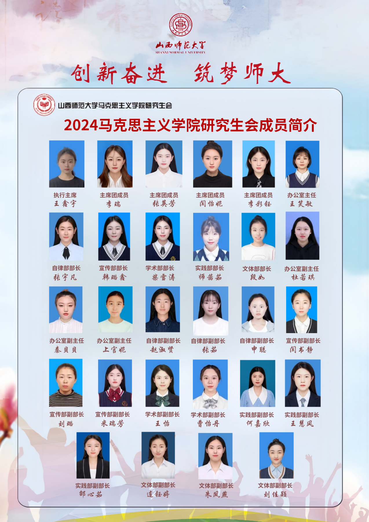 3003新葡官方网站研究生会是在院党委领导、院团委指导下的青年学生组织,现设有办公室、自律部、宣传部、学术部、实践部、文体部等六个部门。