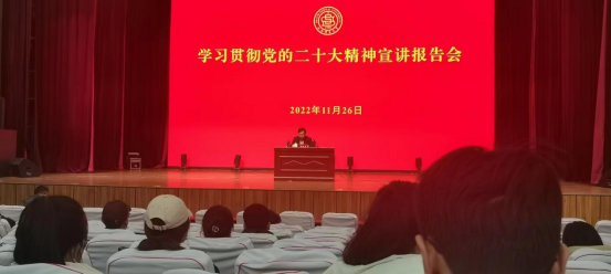 随着音乐的响起,学习贯彻党的二十大精神宣讲报告会正式开始。贾绘泽校长做关于党的二十大精神和论文选题内容的报告。