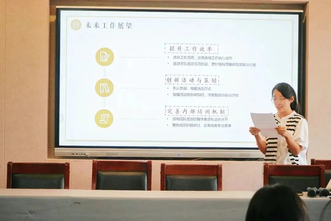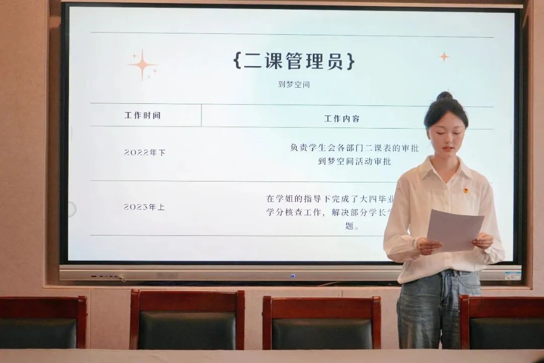 答辩结束后,院团委副书记张瑞琴作了总结发言。她首先对团委学生会全体成员一年来的辛苦付出表示感谢,紧接着,她从三个方面对同学们提出了建议:一要抓好学习与工作、细节和全局、创新和夯基这三种关系,统筹兼顾,做品学兼优的三好学生,做敢闯会创的高素质骨干,致广大而尽精微;二要重点培养组织协调、人际交往、语言表达三种能力,学会将复杂的问题精简化,加强沟通协调,精益求精,尽职尽责,共同完成工作任务;三要培养敢于追梦的魄力,持之以恒的毅力和条理清晰的能力,追梦不止,踏实奋斗,在提高个人综合素质的同时高效完成各项学生工作。