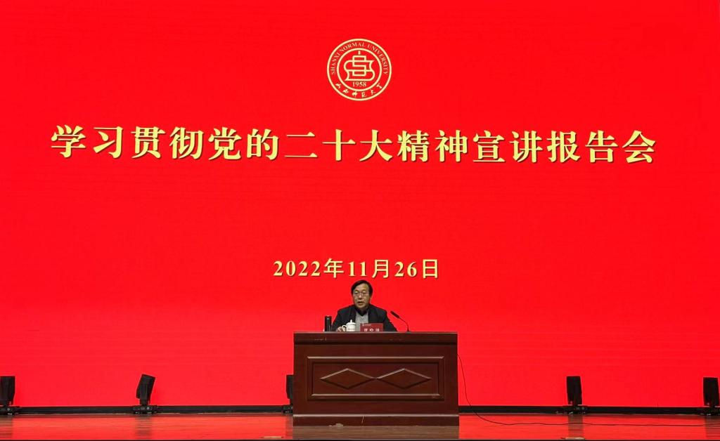 会议邀请了我校学习贯彻党的二十大精神宣讲团成员、副校长贾绘泽教授作宣讲报告。贾绘泽教授从“全面领会大会的主题及主要成果”“深刻认识新时代十年的伟大变革及其里程碑意义”“不断开辟马克思主义中国化时代化新境界”“牢牢把握新时代新征程中国共产党的使命任务”“贯彻落实新时代新征程的战略部署”“用新的伟大奋斗创造新的伟业”等方面进行了深入阐述。他特别指出,党的十八大以来的山西这十年,争先进位、改革攻坚、文化强省、倾力民生、减污增绿、浴火淬炼,不断取得新的突破,真抓实干、久久为功,续写了山西践行新时代中国特色社会主义新篇章。