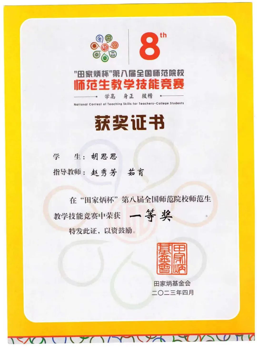 2023年4月15日至16日,“田家炳杯”第八届全国师范院校师范生教学技能竞赛决赛在浙江师范大学举行。新葡官网思想政治教育专业2020级学生胡思思(指导老师:赵秀芳、茹育)荣获一等奖。这是新葡官网在本科生培养工作中取得的突破性成绩。